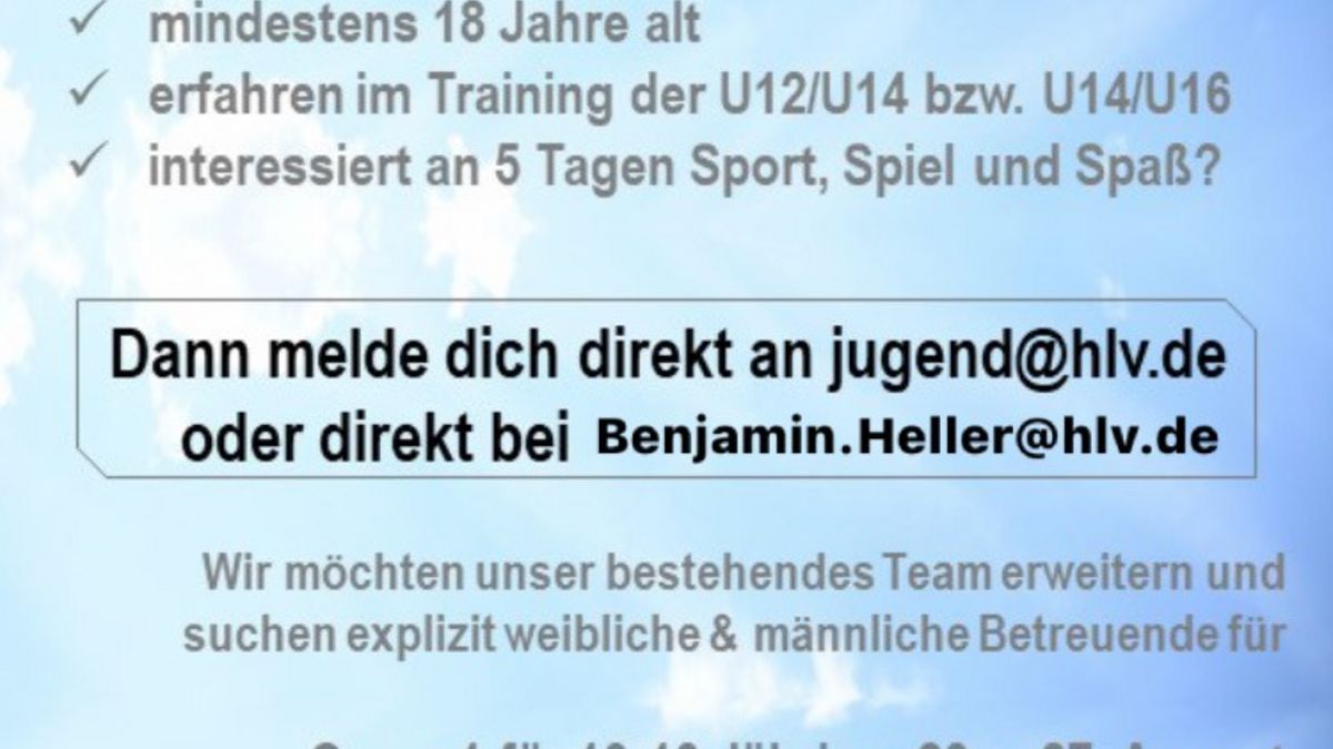 Neben dem Jugendcamp, finden noch zwei weitere Camps in den hessischen Sommerferien in Alsfeld statt: die Nachwuchscamps 1 und 2 für 10-13 Jährige sowie 13-16 Jährige. Hierfür sucht die HLV Jugend noch motivierte Betreuerinnen und Betreuer, die erfahren im Training der U12/U14 bzw. U14/U16 sind, mindestens 18 Jahre alt sind sowie Motivation für 5 Tage Sport, Spiel und Spaß besitzen. Sofern ihr Interesse habt, bitten wir euch um eine kurze formlose E-Mail an jugend(@)hlv.de oder direkt an den Campleiter benjamin.heller(@)hlv.de. Wir freuen uns auf eure Nachrichten!